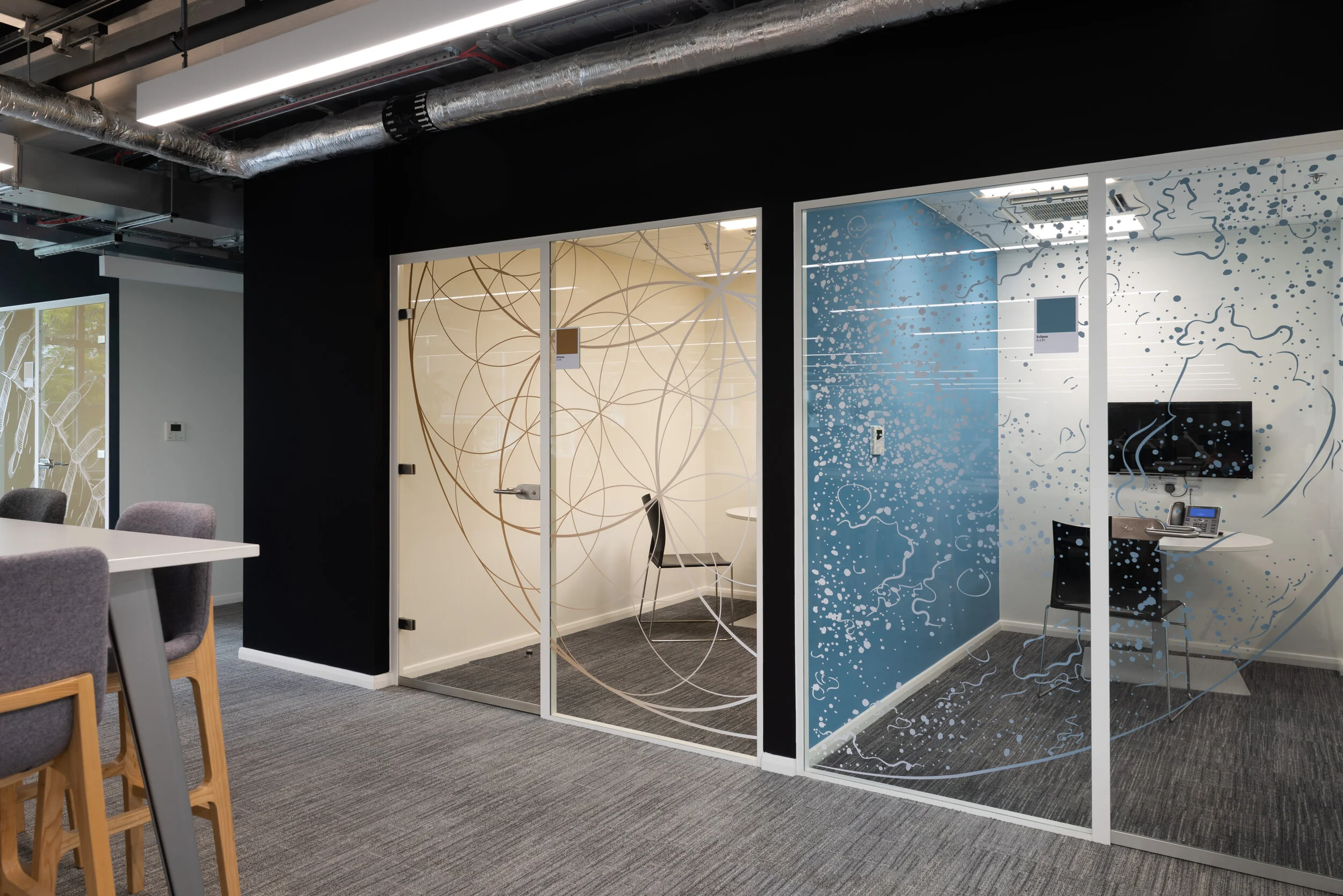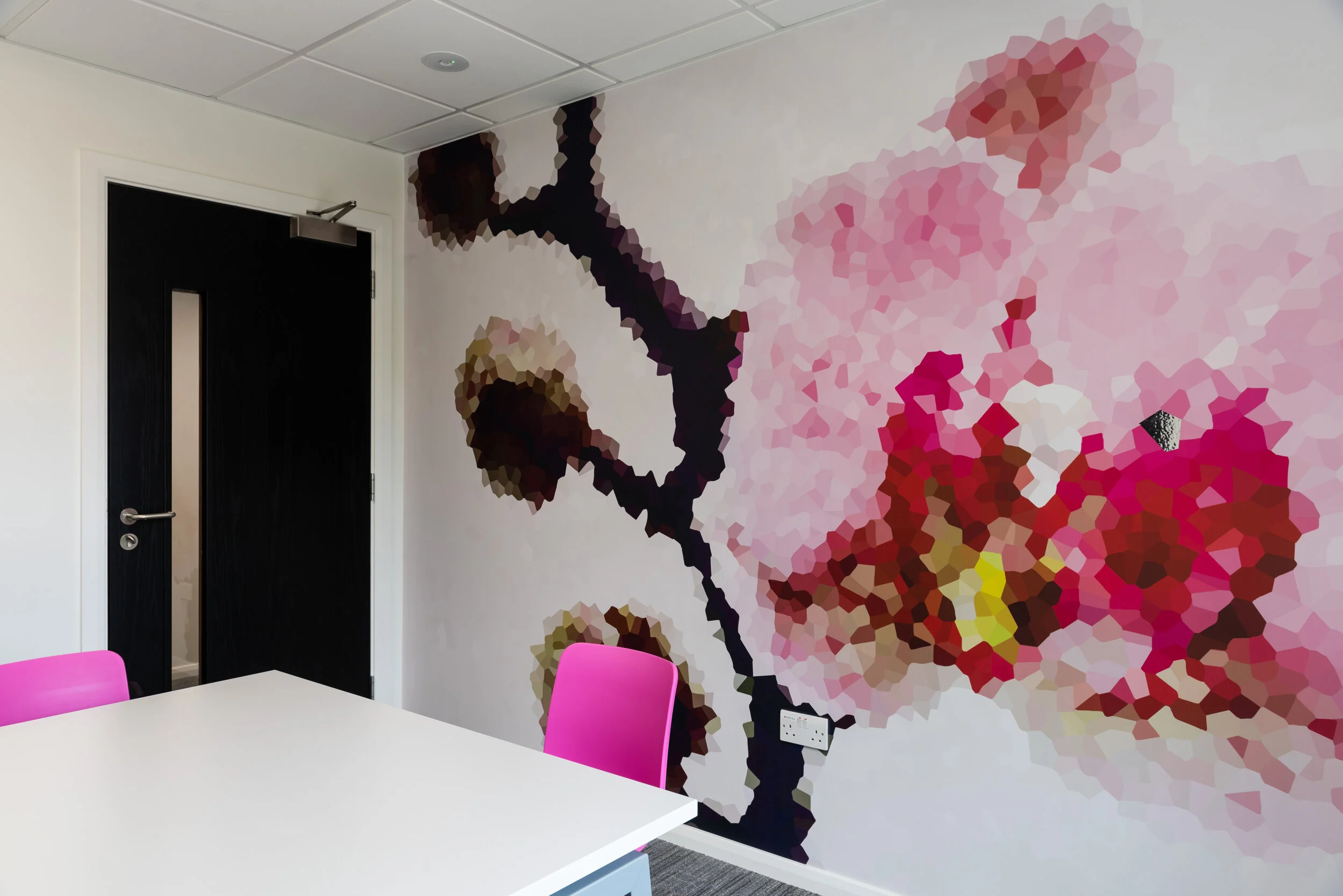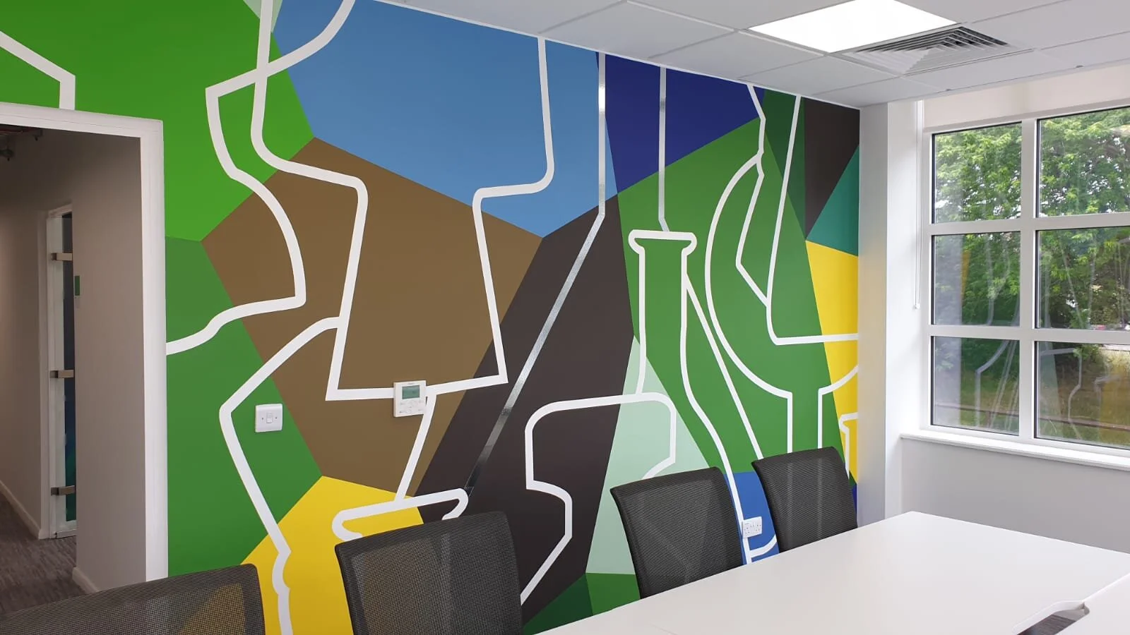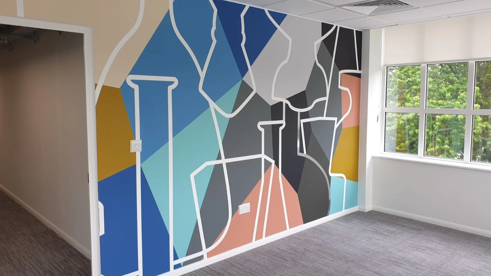 We created a series of manifestations, murals, accent colour walls and signage that celebrated the brand's product line, heritage ingredients and their story. The series bring colour and vibrancy to the various spaces whilst the content creates moments of interaction with the brand. The hand painted murals were inspired by the newly built laboratories on site and the bespoke palette used across the installation. A reflective detail of chrome vinyl was added to the final work